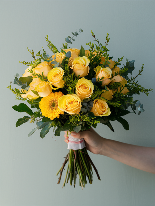 Embrace the warmth and cheer of the All Yellow Blooms Bouquet, a radiant arrangement that...