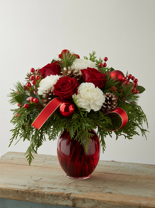 Celebrate the season with the vibrant charm of this stunning Christmas bouquet. Featuring a radiant...