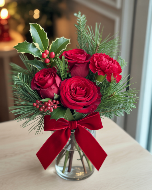 A small and festive Christmas bouquet arranged in a clear glass vase, featuring three vibrant...
