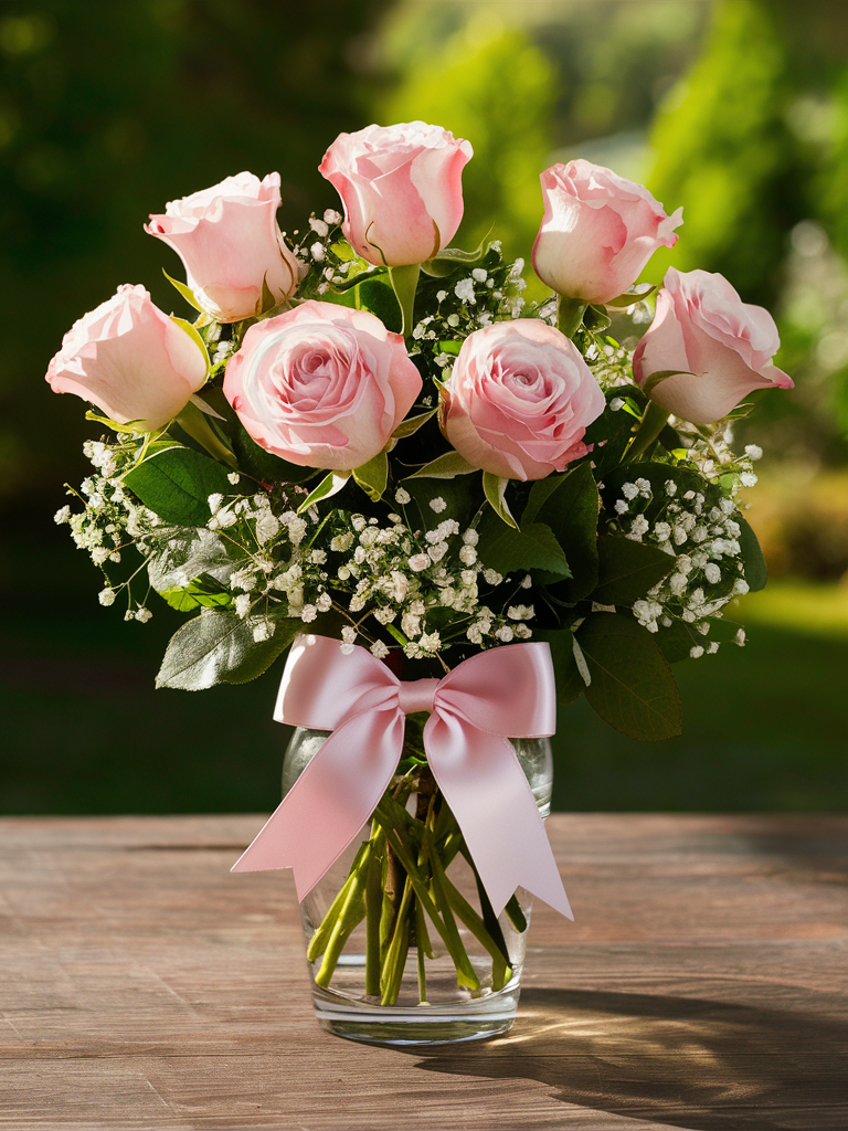 Embrace sophistication with the Elegant Blush bouquet. This exquisite arrangement features twelve delicate pink roses, thoughtfully wrapped in sleek black paper. The soft pink blooms symbolize grace and admiration, while the chic black wrapping adds a touch of modern elegance. Perfect for expr...