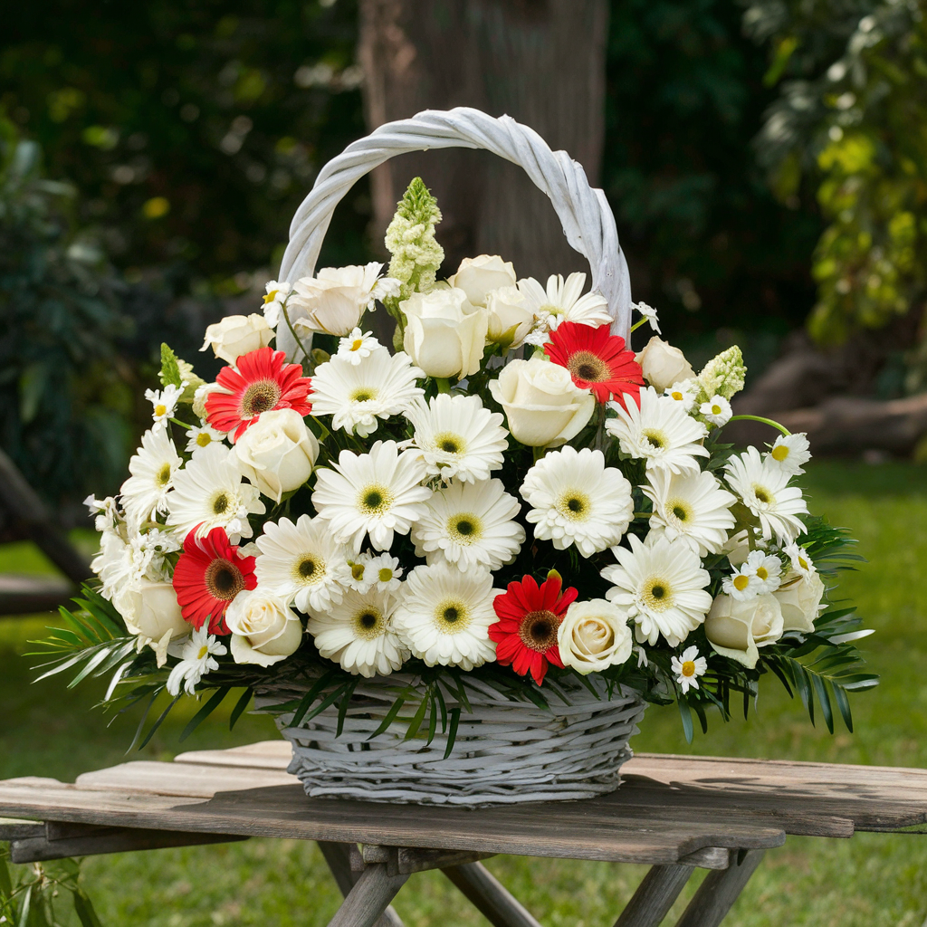 The The Sunset Harmony Sympathy Basket bursts with a lively mix of yellow, red, and orange flowers, arranged in a classic woven basket. This bright and uplifting arrangement features cheerful yellow roses, bold red gerberas, and vibrant orange lilies, all complemented by lush greenery. The viv...