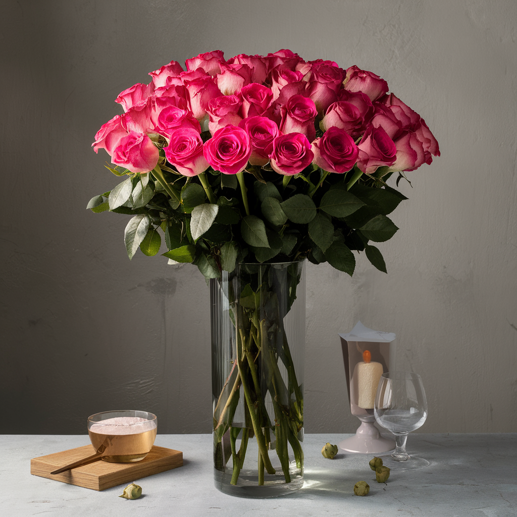 12 Hot Pink Roses in a Cylinder Glass Vase