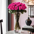 Brighten up any space with our stunning bouquet of 12 hot pink roses, elegantly arranged in a tall, clear glass cylinder vase. Each rose is hand-picked for its vibrant color and perfect bloom, creating a bold, eye-catching display. The sleek glass vase accentuates the lush greenery and radiant petals, making this arrangement a striking centerpiece for any occasion. Whether you're celebrating a special event or simply adding a touch of glamour to your home, these hot pink roses offer a delightful burst of color and sophistication.