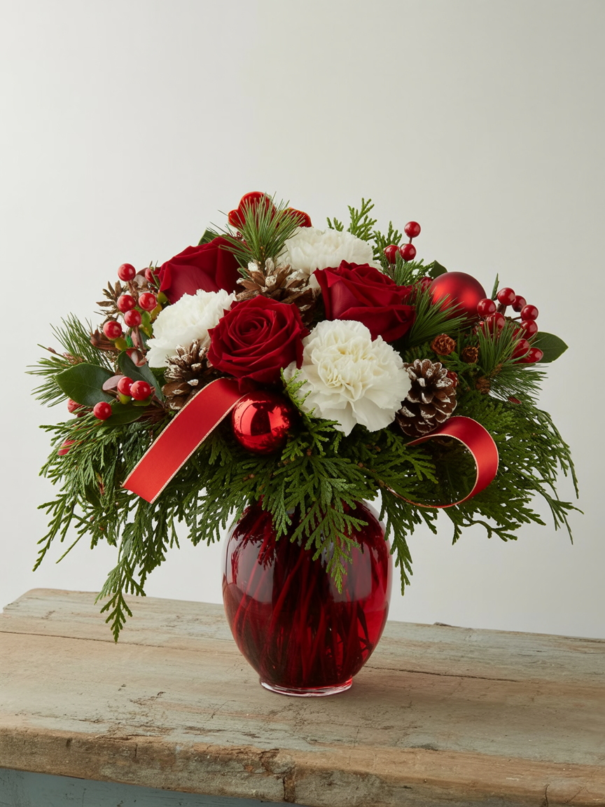 Bring classic Christmas charm to your home with this elegant arrangement in a glossy red glass vase. Deep crimson roses, snowy white carnations, and fluffy white mums are beautifully layered among fresh evergreens, creating a festive centerpiece that captures the warmth and magic of the holiday season.