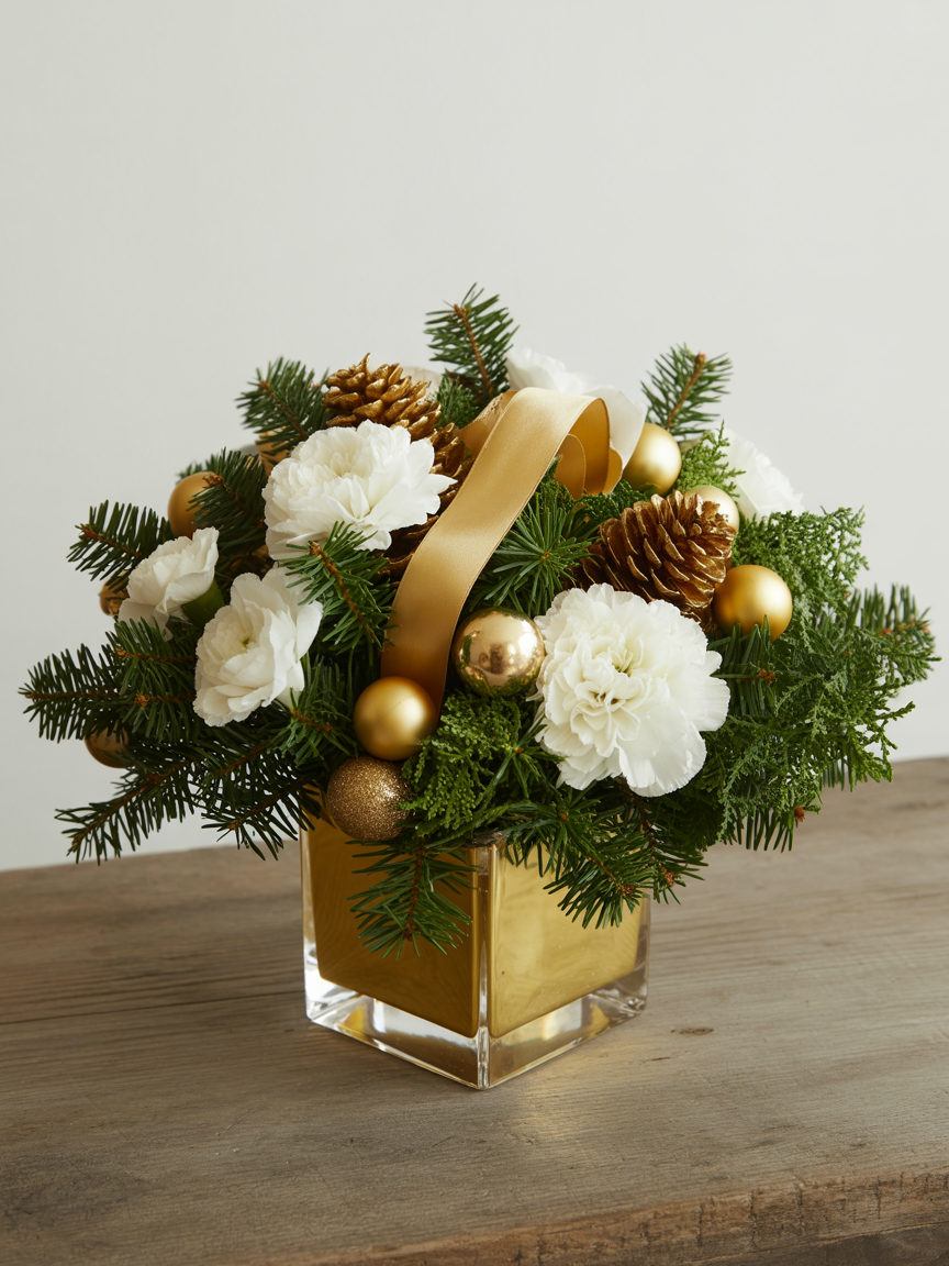 This Christmas floral arrangement brings an effortless elegance to any holiday setting. The combination of lush evergreens with crisp white mums and carnations creates a refreshing wintery look—clean, bright, and timeless. The gold accents, from the gleaming ornaments to the soft satin ribbon and the stylish gold-rimmed vase, add a luxurious shimmer that catches the light beautifully, making the entire display feel festive and refined.