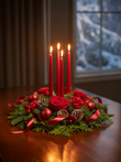 Illuminate your holiday table with this stunning red centerpiece, featuring elegant taper candles surrounded by lush seasonal greenery. Rich red accents shimmer among pristine red blooms, creating a sophisticated and timeless arrangement. Perfect for Christmas gatherings, winter parties or festive home décor, this handcrafted centerpiece adds warmth, luxury, and effortless elegance to any celebration